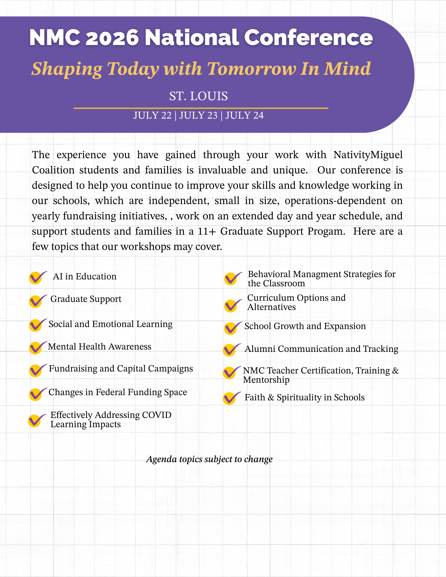 Two years ago, we met in Boston to connect in person for the first time since COVID. What an experience it was! Now, we want to build on that momentum as we invite you to join us at our 2026 NMC National Conference in St. Louis this summer on July 22 -July 24.